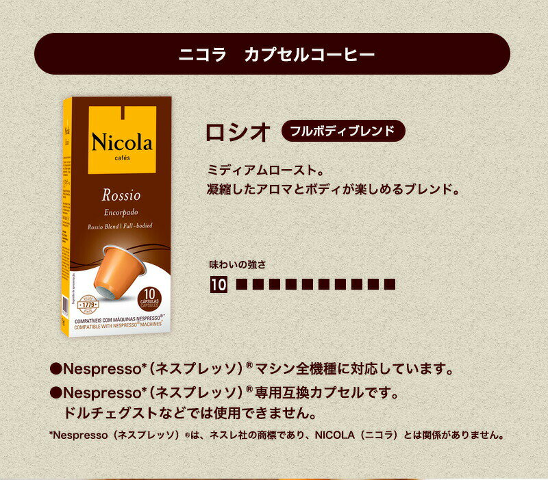 味わいの強さ:10 ■■■■■■■■■■ NICOLA(ニコラ)カプセルコーヒーは*Nespresso(ネスプレッソ)(R)マシン全機種に対応しています。
